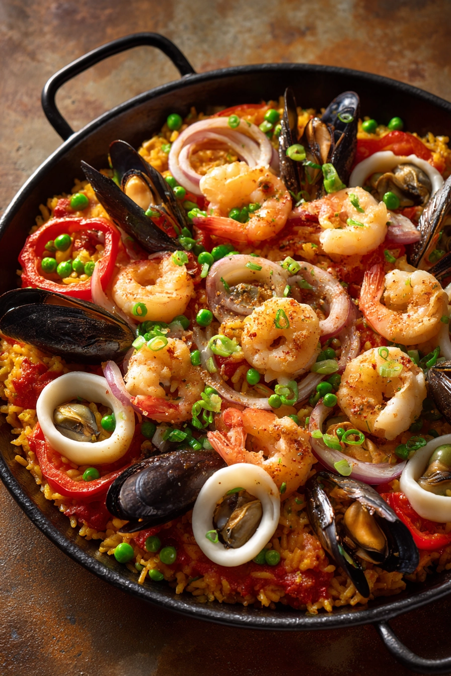A classic Spanish dish featuring saffron-infused rice cooked with a variety of fresh seafood, vegetables, and aromatic spices for a vibrant and flavorful meal.