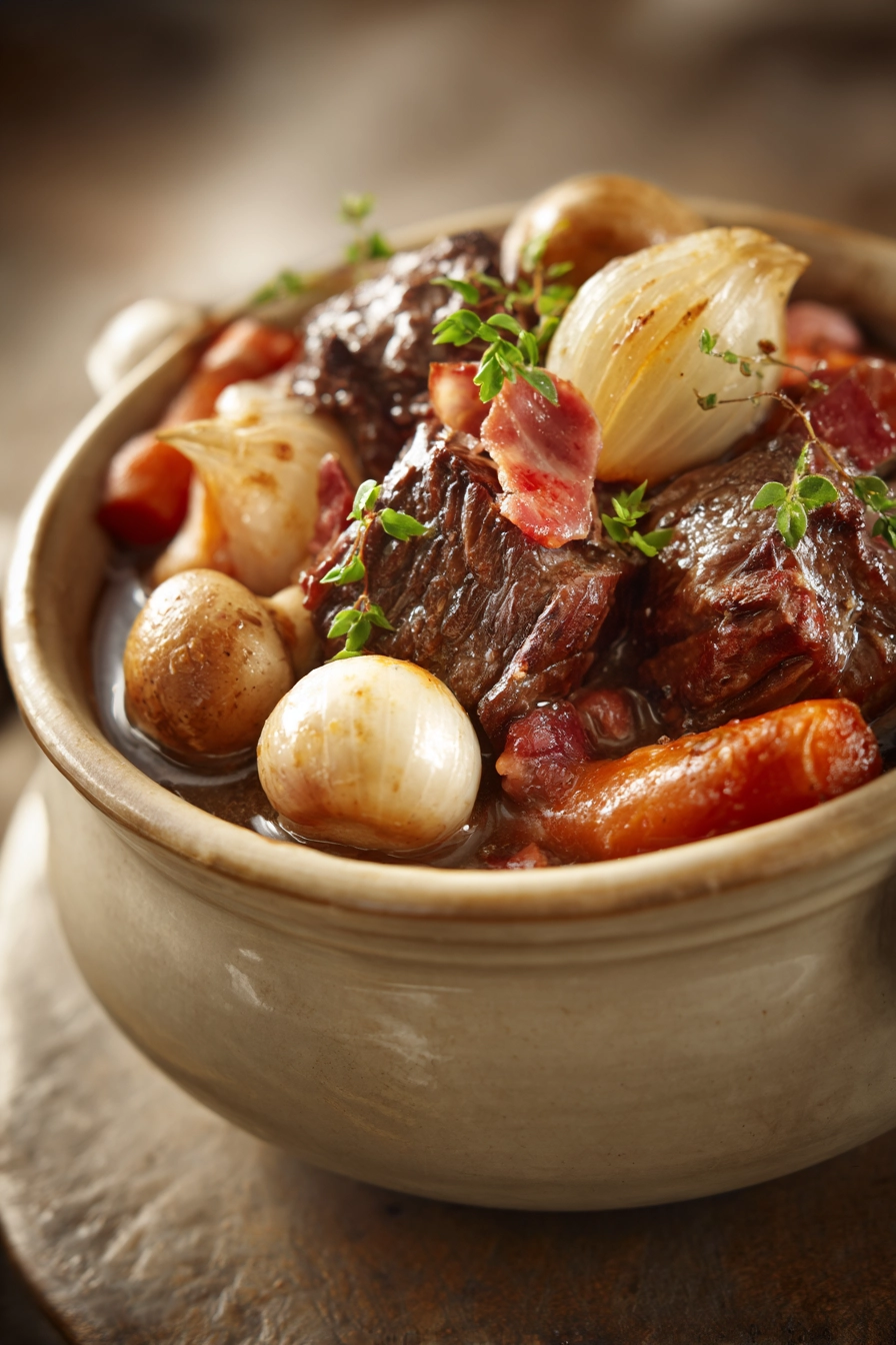 I still remember the first time I made this stew. The kitchen filled with the rich aroma of red wine and garlic mingling softly with sizzling bacon. The sound of bubbling broth and the slow transformation of humble ingredients into something extraordinary pulled me closer to the stove, promising comfort in every bite. When the stew finally came together, the tender beef practically melted in my mouth, and the sauce clung lovingly to every morsel. It was a quiet moment of satisfaction, the kind that makes you pause and savor more than just the food.