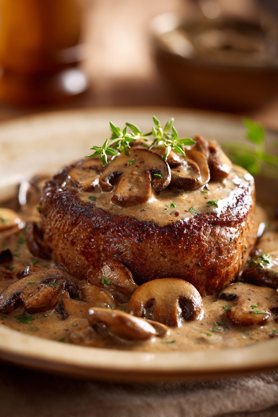 A tender and juicy filet mignon cooked to perfection and served with a rich, creamy mushroom sauce. This elegant dish is perfect for special occasions or a gourmet dinner at home.